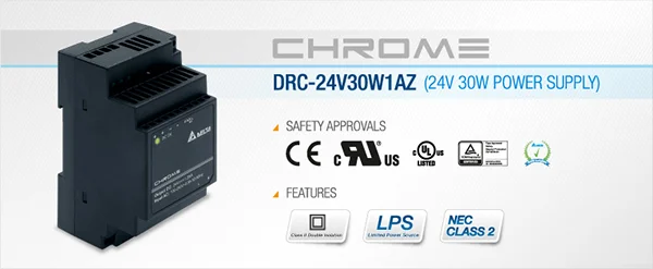The DRS-24V30W1AZ is certified to major safety approvals including IEC/EN/UL 60950-1 & CCC to GB9254, GB17625.1 and GB4943.1 for ITE and UL 508 for Industrial. The output circuit also complies with NEC Class 2 (UL 60950-1) and Limited Power Source (IEC/EN 60950-1); EMI standard according to EN 55022, EN 61000-6-3 and EN 61000-6-4 Class B. All Delta industrial power supplies are fully compliant with RoHS Directive 2011/65/EU for environmental protection.