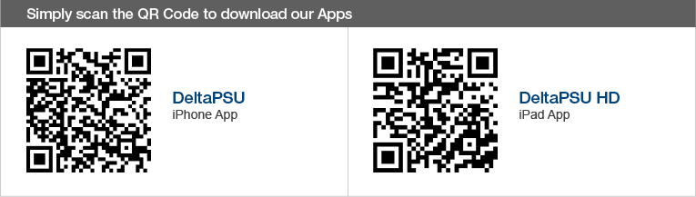 Our catalog is also available on iPad and iPhone Apps. Simply search for DeltaPSU (iPhone) or DeltaPSU HD (iPad) to download the free App from the App Store. You can also scan the QR Code below to download our Apps.