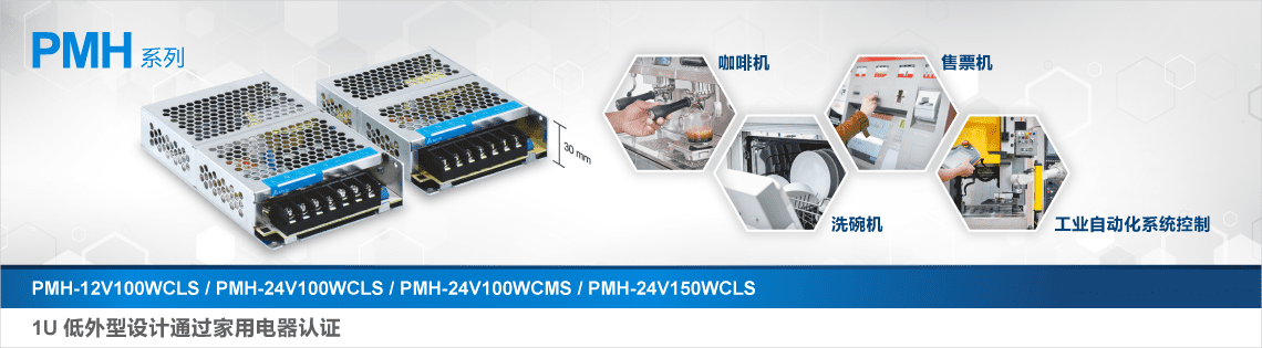 新款 PMH 系列 1U 低外型平板式电源供应器带有 EN 60335 家用电器认证