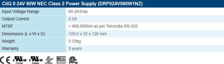 Delta Electronics is introducing the CliQ II DIN Rail 24V 60W NEC Class 2 (DRP024V060W1NZ) certified power supply. The product can be used in general Industrial applications especially for dry indoor environment with the advantage of lower wiring cost for a system due to compliance with NEC Class 2 requirements. The NEC (National Electrical Code) is a North American standard, which is regarded as a law in most North American states. The NEC describes the installation of electric conductors and equipment within or on buildings. The CliQ II 24V 60W NEC Class 2 features universal AC input and high efficiency at > 87%. It also will not have output power de-rating for the entire range of input voltage from 85Vac to 264Vac. This is useful for system that requires full output power at low input voltage. Typical DIN Rail power supply with similar specs starts to de-rate at input voltage below 90Vac.