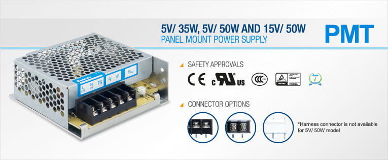 Delta Electronics is extending the highly affordable and reliable PMT panel mount power supply series with the addition of three new models. The new products are two 5V models with power ratings of 35W and 50W and a 15V model with power rating of 50W. The PMT-5V35W1AA, PMT-5V50W1AA and PMT-15V50W1AA feature Universal AC input and international safety approval according to IEC/EN/UL 60950-1 and EMI standards according to EN 55022, Class B. All Delta power supplies comply fully with RoHS Directive 2011/65/EU for environmental protection.