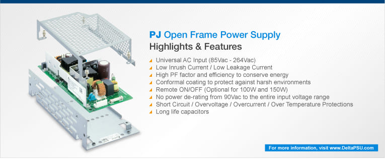 Delta PJ series of Open Frame Power Supply offers the most widely used output voltages of 12V and 24V with power ratings of 50 Watt, 100 Watt and 150 Watt. These products come with universal AC input at 85Vac to 264Vac with features including low leakage and low Inrush current. The PCBAs are applied with conformal coating to provide protection against dust and chemical pollutants while the built-in active PFC provides PF > 0.97 and fulfills Harmonic Current Emission according to IEC/EN 61000-3-2. The series of products is further certified for EMC standards according to EN55011 for Industrial, Scientific and Medical (ISM) radio-frequency equipment; EN55022 for Industrial Technology Equipment (ITE) radio-frequency equipment and EMS according to EN55024.