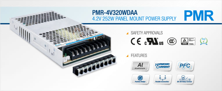 Delta introduces the highly reliable low profile PMR panel mount power supply series. The PMR series is designed for LED signage application where efficient heat dissipation for the components are crucial in a low profile control cabinet. The excellent design offers highly efficient thermal management without the need for fan. This increases the reliability of the product by reducing one moving part. At only 30mm height and encased in a full corrosion resistant aluminium body, the PMR-4V320WDAA which is the first model launched in the series also has built-in active PFC circuit