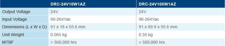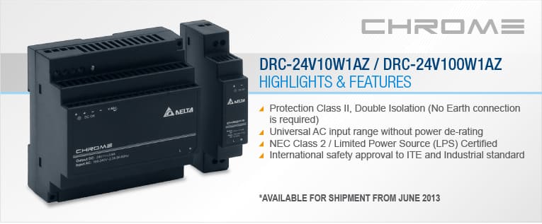 Delta’s Chrome DIN Rail Power Supply series is designed for use in compact cabinets which are widely adopted in home automation and Food & Beverages industries. Current available specifications are with 24V output voltage for power ratings of 10W (DRC-24V10W1AZ) and 100W (DRC-24V100W1AZ). Delta’s Chrome Power Supply series offers double isolated input that eliminates the need for Earth connection, thus, resulting in low leakage current. The Chrome series features universal AC input range and is certified to safety standard according to IEC/EN/UL 60950-1 Information Technology Equipment (ITE) and UL508 Industrial Control Equipment (ICE). The series is also fully compliant with RoHS Directive 2011/65/EU for environmental protection. NEC Class 2 and Limited Power Source (LPS) approval are available for the above models.