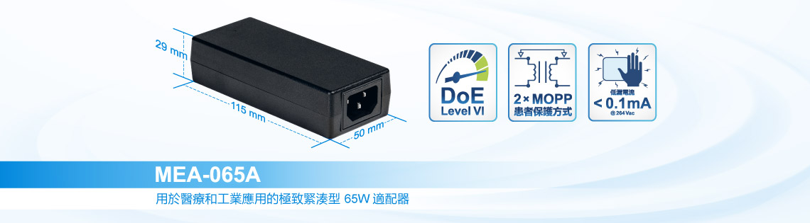 台達電子推出新 MEA 系列醫療用 65W AC-DC 桌上型適配器。MEA-065A 配備 4 種單路輸出電壓即 12V、15V、19V 及 24V,尺寸極為緊湊,僅 50 x 115 x 29 mm (1.97”x 4.52” x 1.14”),適用於各種便攜式設備,諸如家用健康照護設備、實驗及測量設備等。產品漏電流低至 0.1mA, 絕緣防護等級達到 2 x MOPP 標准。
