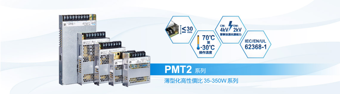 台達新推出 PMT2 35-350W, 12V 至 48V 多款輸出電壓型號,同時也推出 75W, 5V/12V 及 5V/24V 雙電壓全系列平板式電源供應器。產品薄型化設計,高度僅 30mm,方便安裝及機櫃空間運用。並符合衝擊與振動國際標準法規要求(達到 IEC 60068-2-27 及 IEC 60068-2-6 標准)。具備薄型化&高性能等特色,-30°C 至 +70°C 之寬範圍操作溫度以及符合國際 IEC 61000-4-5, Level 4 (CM: 4kV, DM: 2kV) 高抗雷擊浪湧能力。