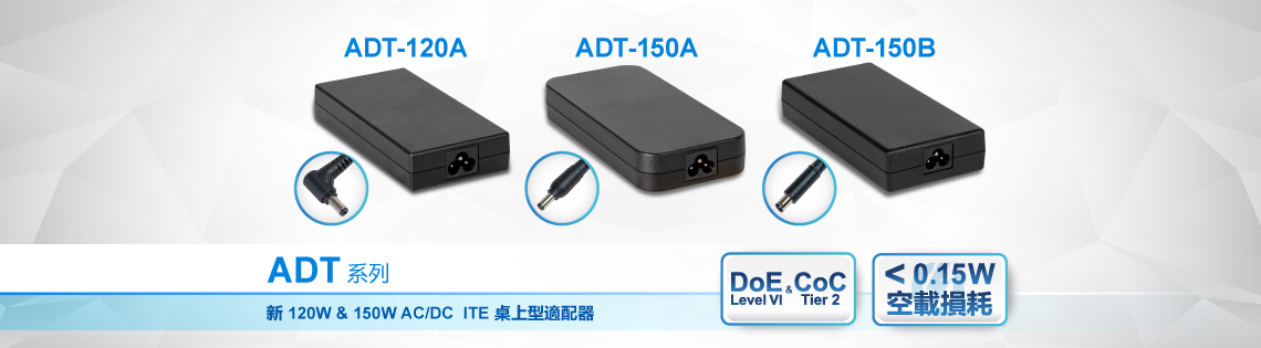 ADT-120A / ADT-150A / ADT-150B 是台達發佈的 ADT 系列的最新機種,分別為 120W/12V、150W/12V 及 150W/24V 單路輸出,效率高達 92%,滿足美國能源部(US DoE)Level VI 標準及歐盟 CoC (Code of Conduct) Tier 2 要求,115Vac 及 230Vac 輸入下空載功耗低至 0.15W 以下。